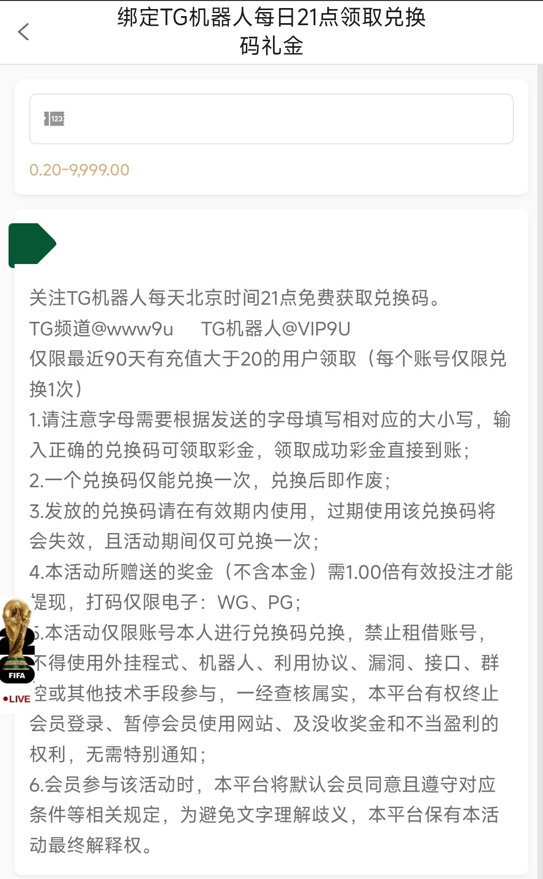 近90天内有充值大于20U以上的才能领这个彩金,TG频道:@www9u TG机器人:@VIP9U