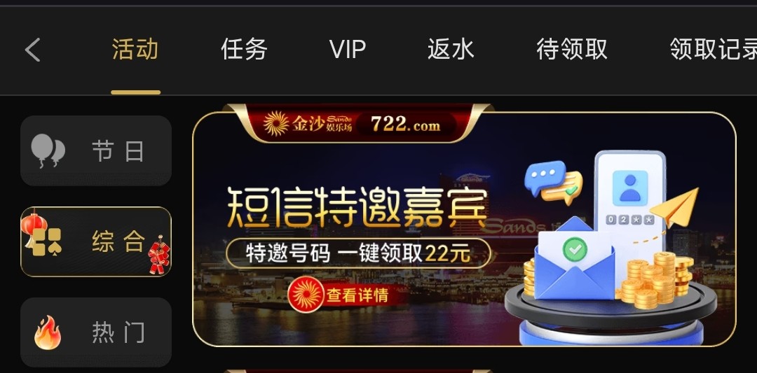 之前就有发过这个帖子还没有碰瓷过的哥们可以去试一下,注册好在优惠里点综合找到短信特邀在领取获取验证码领取,10倍流水,高低取款220,仅限电子/棋牌/捕鱼